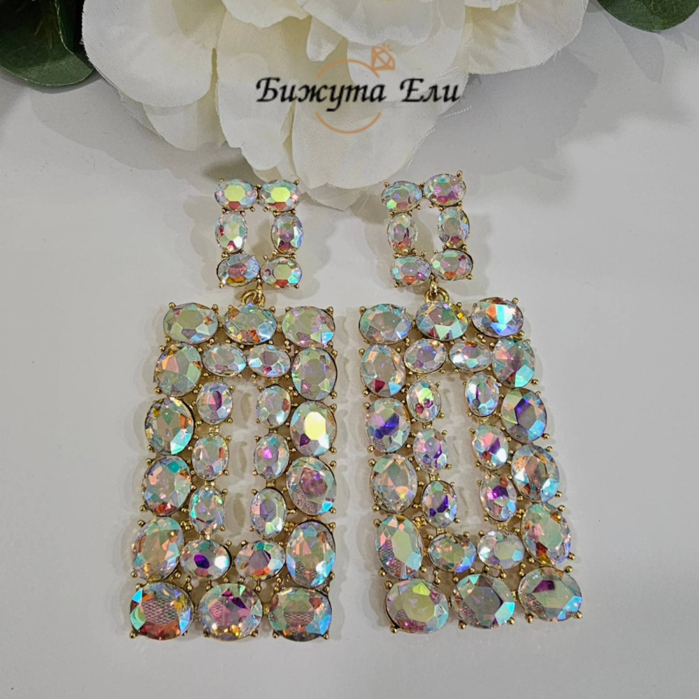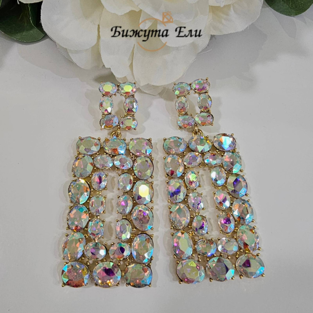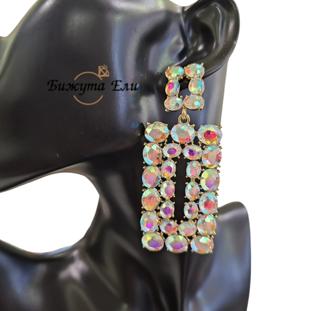Впечатляващ модел с изящна геометрична форма и бляскави многоцветни кристали с аврора ефект. Обиците улавят светлината при всяко движение и придават луксозен завършек на всяка визия – от официални събития до специални вечери. Ефектни и изключително женствени – акцентът, който няма да остане незабелязан.