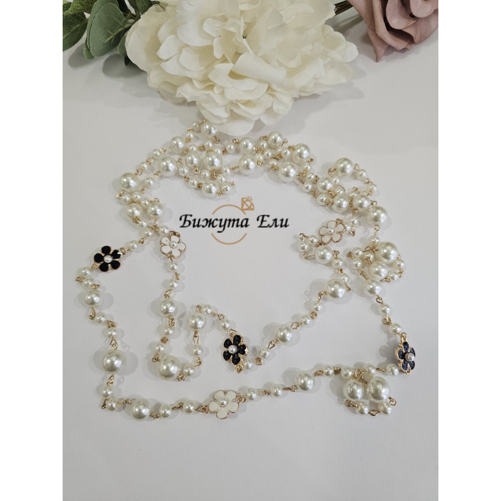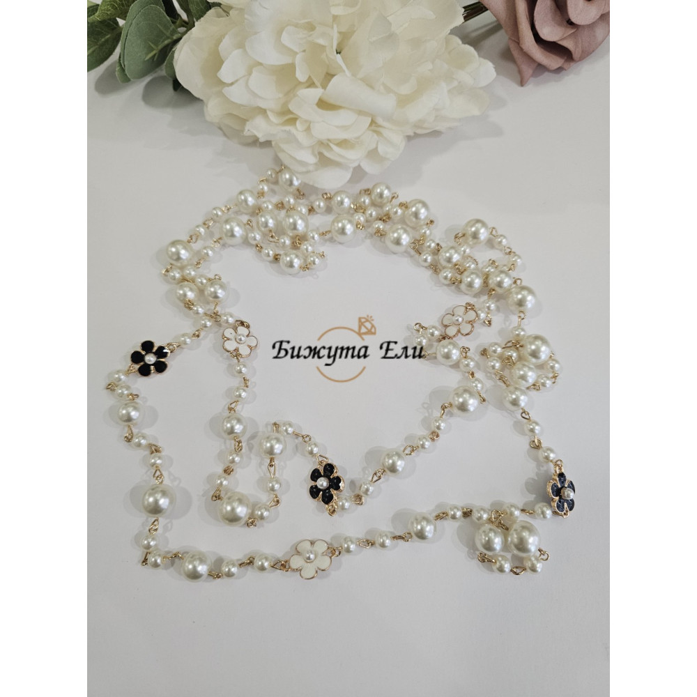 Изискано колие, което съчетава класическата красота на перлите с нежни флорални акценти в златисто, бяло и черно. Моделът е създаден, за да подчертае женствеността и стила – както в ежедневието, така и при специални поводи.