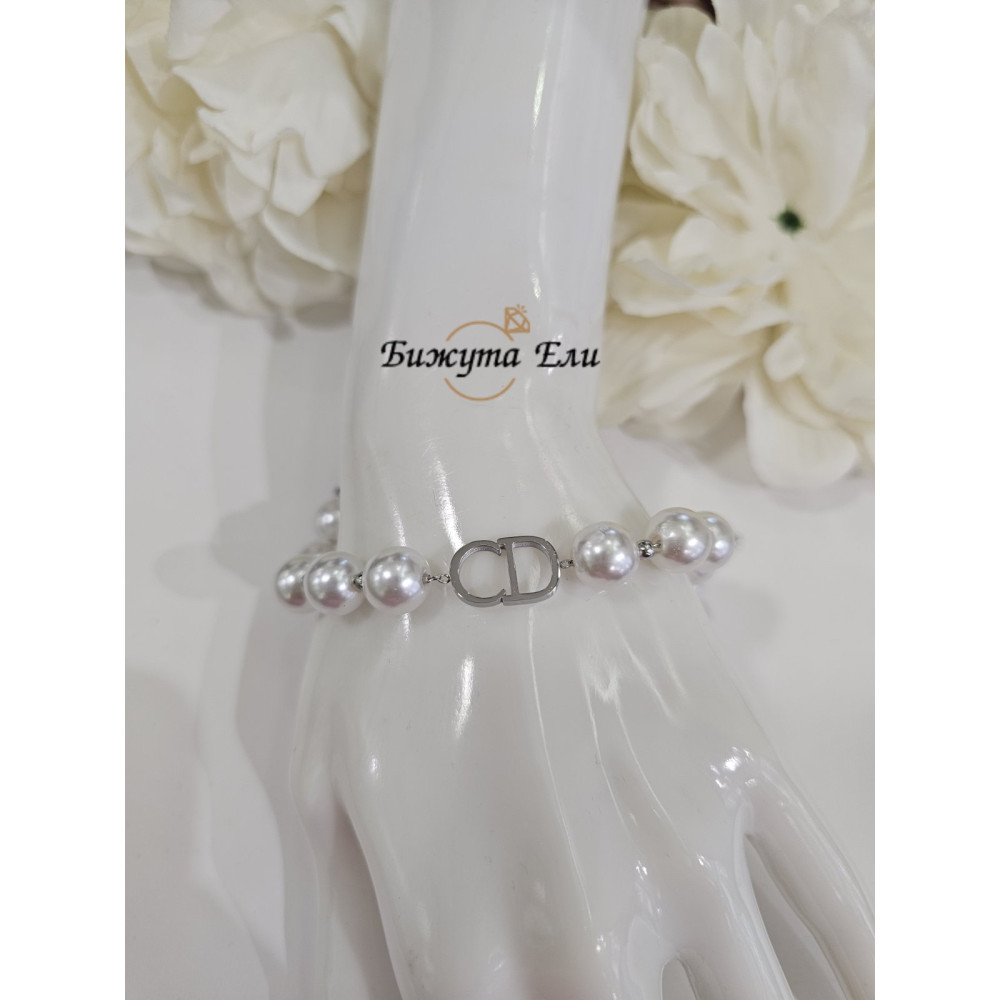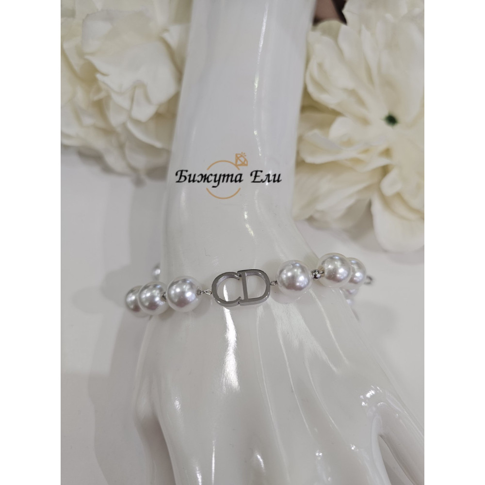 Елегантна дамска гривна, която съчетава класическата красота на перлите с модерен сребрист акцент. Фините перли придават нежност и изтънченост, а стилният централен елемент допълва визията с усещане за лукс и баланс.